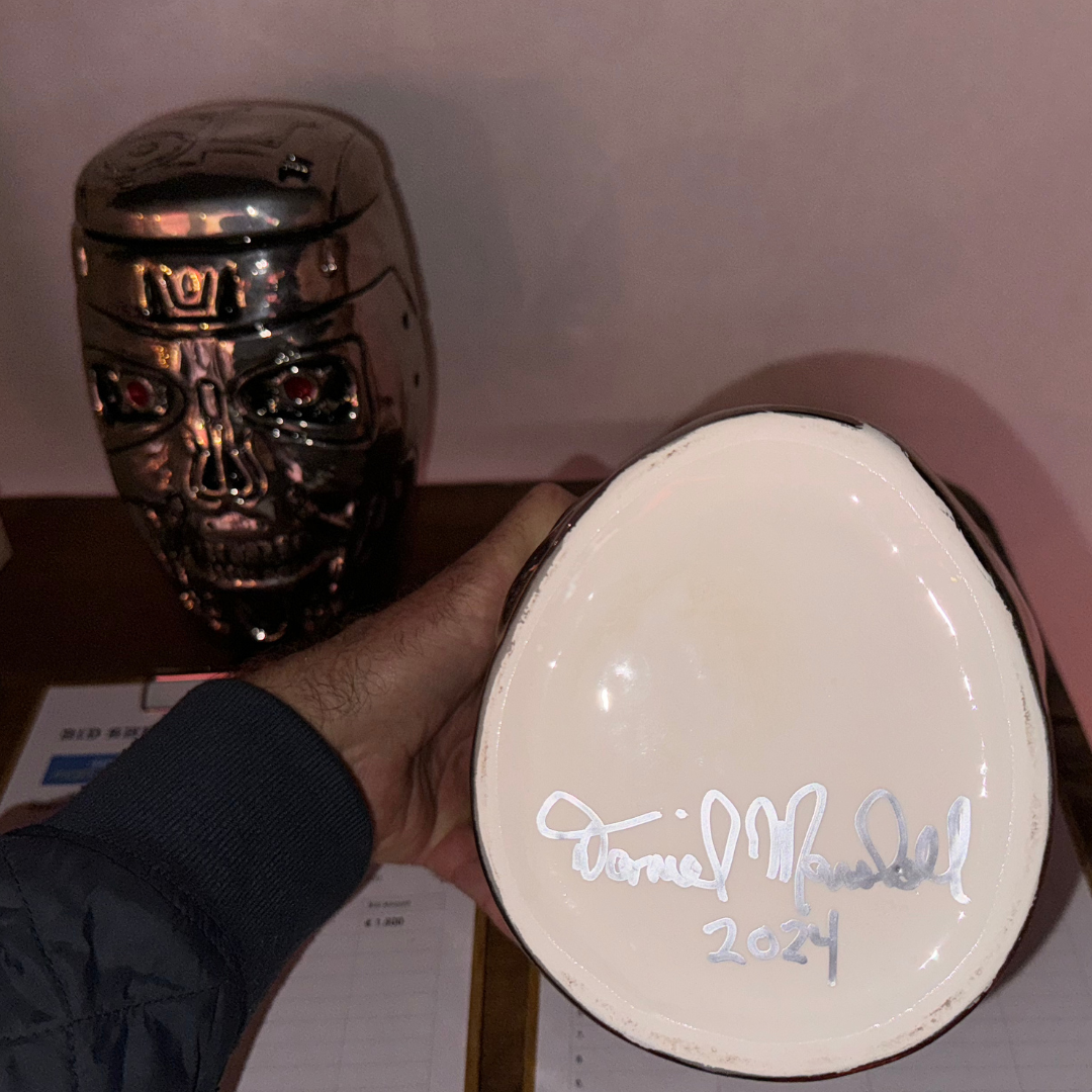 Los Angeles, California (October 1, 2025) – Daniel Marshall has created a Limited Edition “Terminator Endoskeleton Skull Cigar Jar” made by hand on the Amalfi Coast Italy by a master artist in metallic silver fired ceramic. The clay mold for this unique jar was expertly carved from a Terminator Endoskeleton Skull that was made by the creator of the Terminator character, the famous special effects house, Legacy Studios in Hollywood CA. The Terminator visage was made for Daniel Marshall to create a Terminator Humidor that sold at auction in 2020.